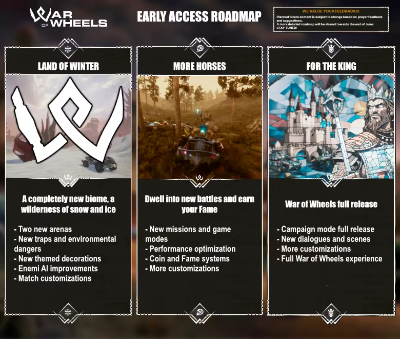 Haluamme tehdä War of Wheelsista yhteisöpohjaisen pelin ja paikan, johon pelaajat palaavat yhä uudelleen. War of Wheelsin ritarillisen luonteen vuoksi uskomme, että maailmaa ei voi luoda kuuntelematta sen ritarien mielipiteitä.