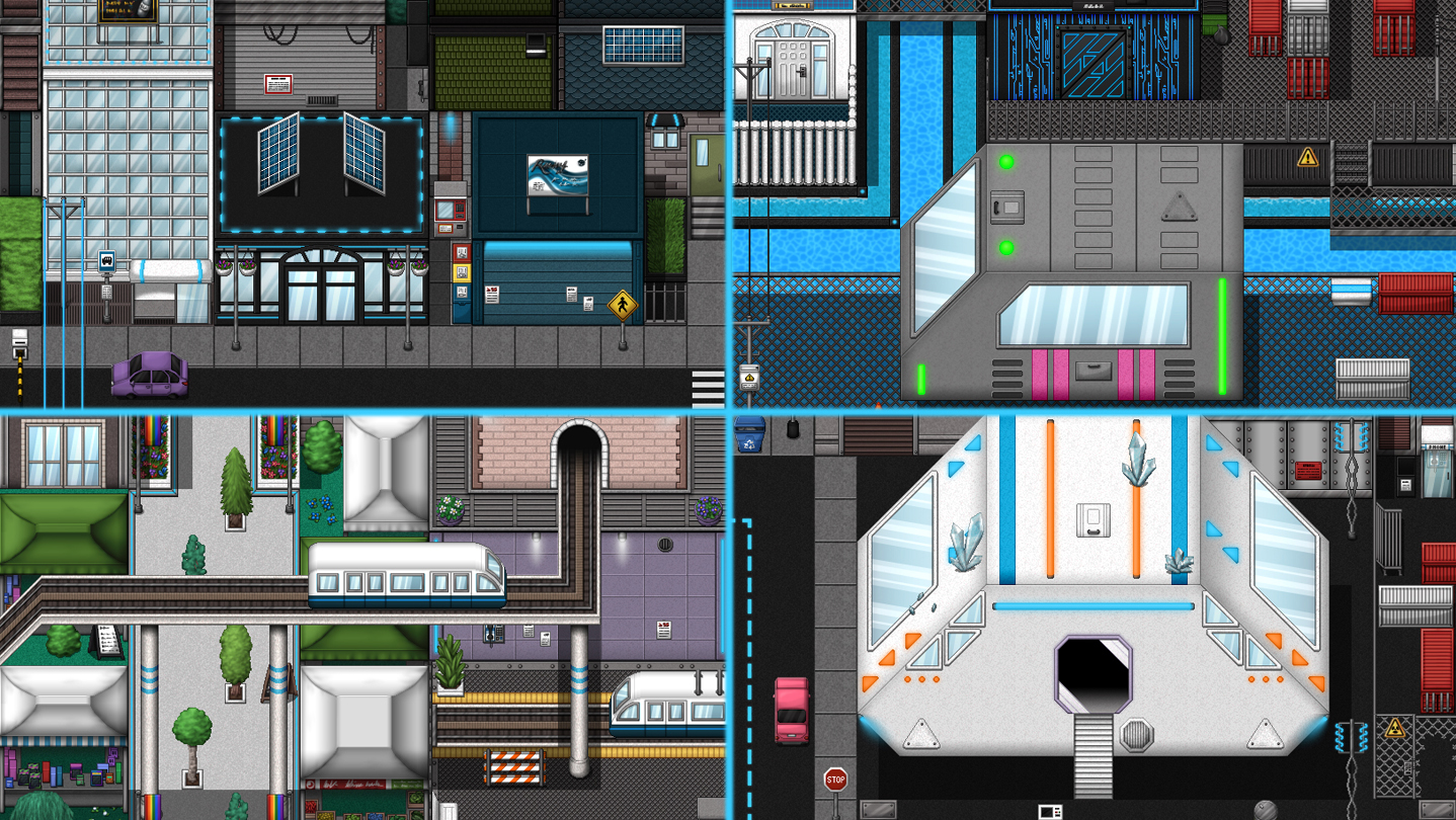Includes 2 items: RPG Maker MZ - Sci-Fi and Modern Tileset - Exterior, RPG Maker MZ - Sci-Fi and Modern Tileset - Interior