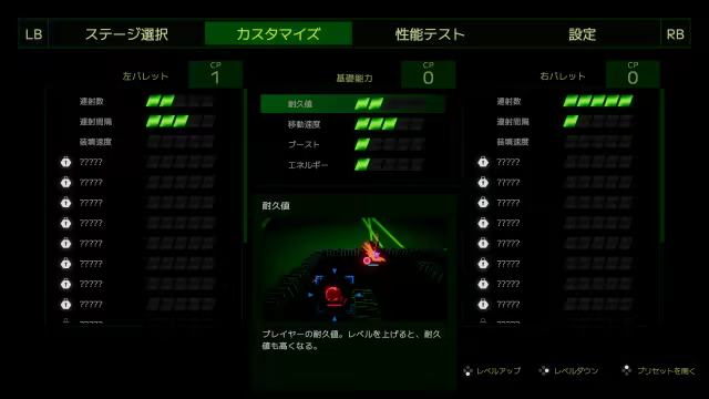 Parameters also include "bullet effects" that grant special effects to attacks. There are effects related to the trajectory of bullets such as "acceleration," "curve," and "tracking," as well as special bullet effects like "expansion" and "absorption." By combining these, players can create their own custom bullets to suit their preferences.