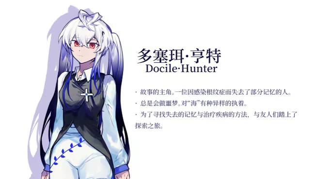 伴随着「根纹症」的流行,「世界」浸没在末日的恐慌中……多塞珥·亨特,一位失忆之人,此时从梦中醒来。在本游戏中玩家将与主角多塞珥·亨特一起见证各种各样的梦境与回忆,一边寻找治疗身体的方法,一边重新认识身边的友人,在旅途中了解家族的历史与末日的真相。