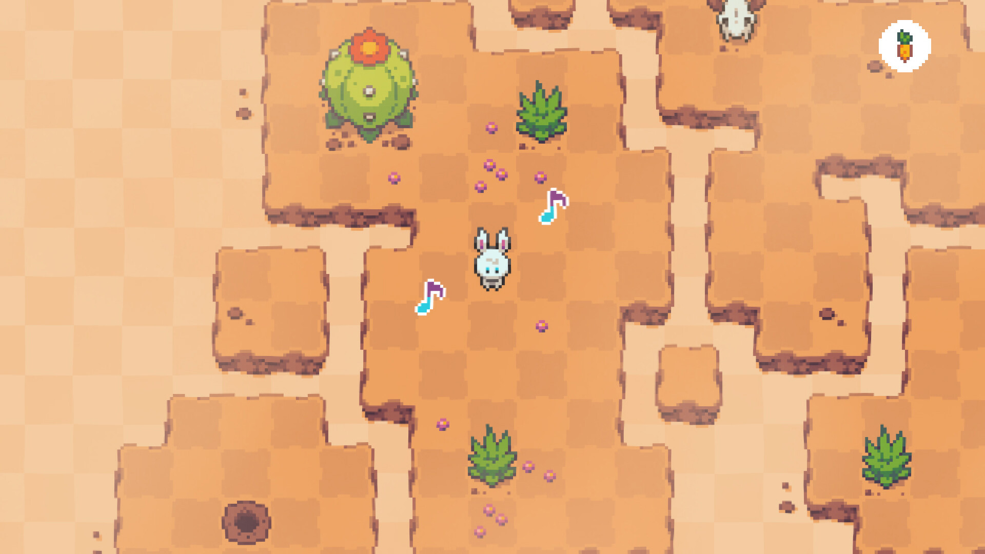 In Rhythm Rabbit, you move automatically on the beat of the music, but the amount of steps (shown by the number of notes) changes on each move. You will have to quickly decide on which way to go, as the rabbit won't stop moving on the beat. The goal of each stage is to get to the carrot.