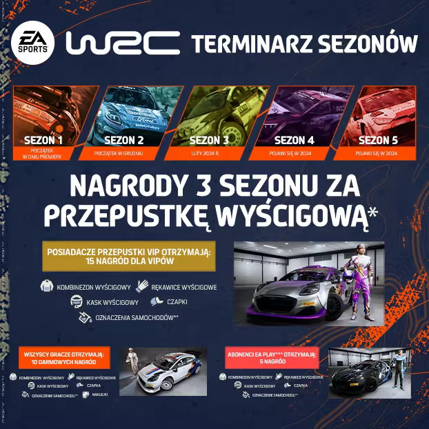 Weź udział w 3. sezonie karnetu rajdowego VIP. Zdobywaj PD za pokonywanie emocjonujących odcinków specjalnych, awansuj na kolejne poziomy w EA SPORTS™ WRC i zdobądź wspaniałe nagrody.