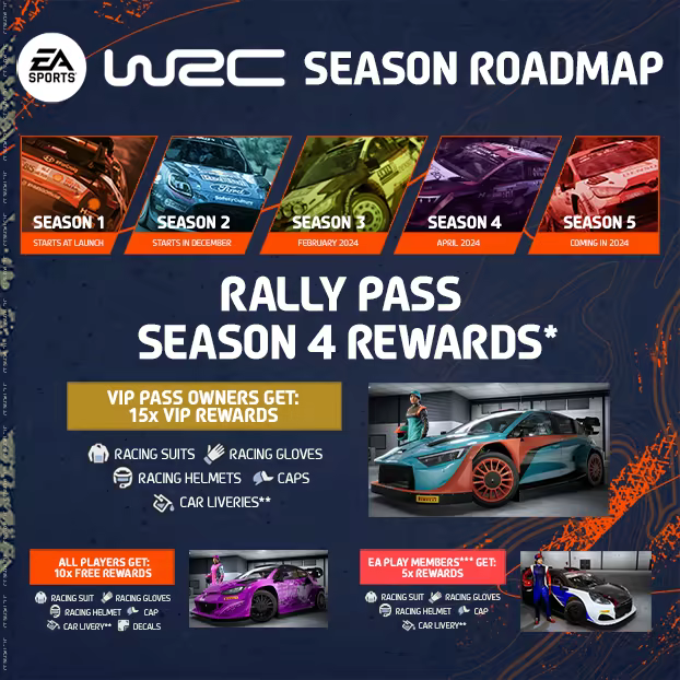 Jump into Season 4 of the VIP Rally Pass. Earn XP as you take on the exhilarating stages and climb up the levels in EA SPORTS™ WRC, unlocking epic rewards along the way.