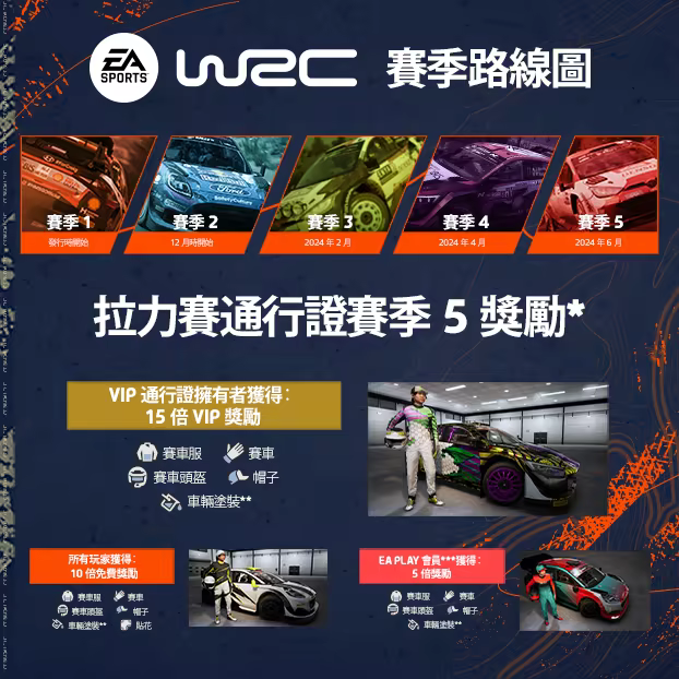 進入 VIP 拉力賽通行證*賽季 5。在令人振奮的關卡中贏得經驗值,並在《EA SPORTS™ WRC》中提升等級,一路上解鎖史詩級獎勵。