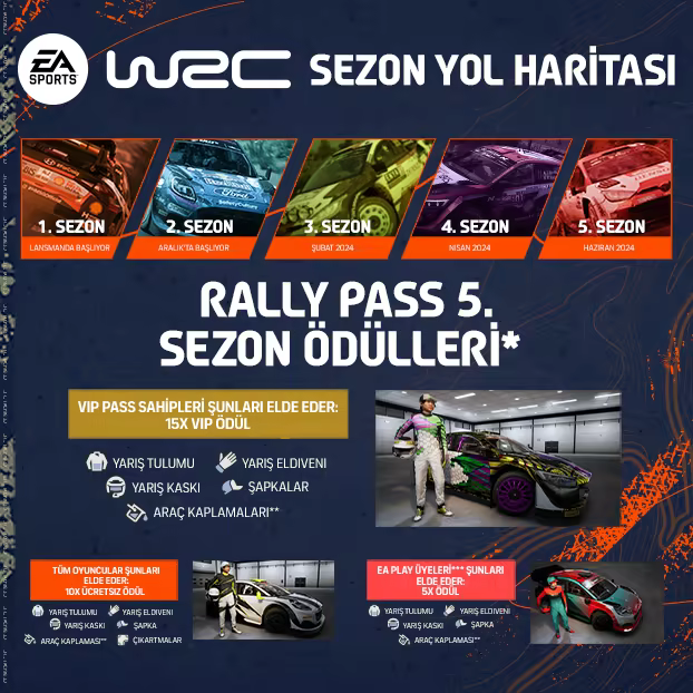 VIP Rally Pass’in* 5. Sezonuna katılın. EA SPORTS™ WRC’de heyecan verici etaplara meydan okurken ve seviyenizi yükseltirken XP kazanarak destansı ödülleri açın.