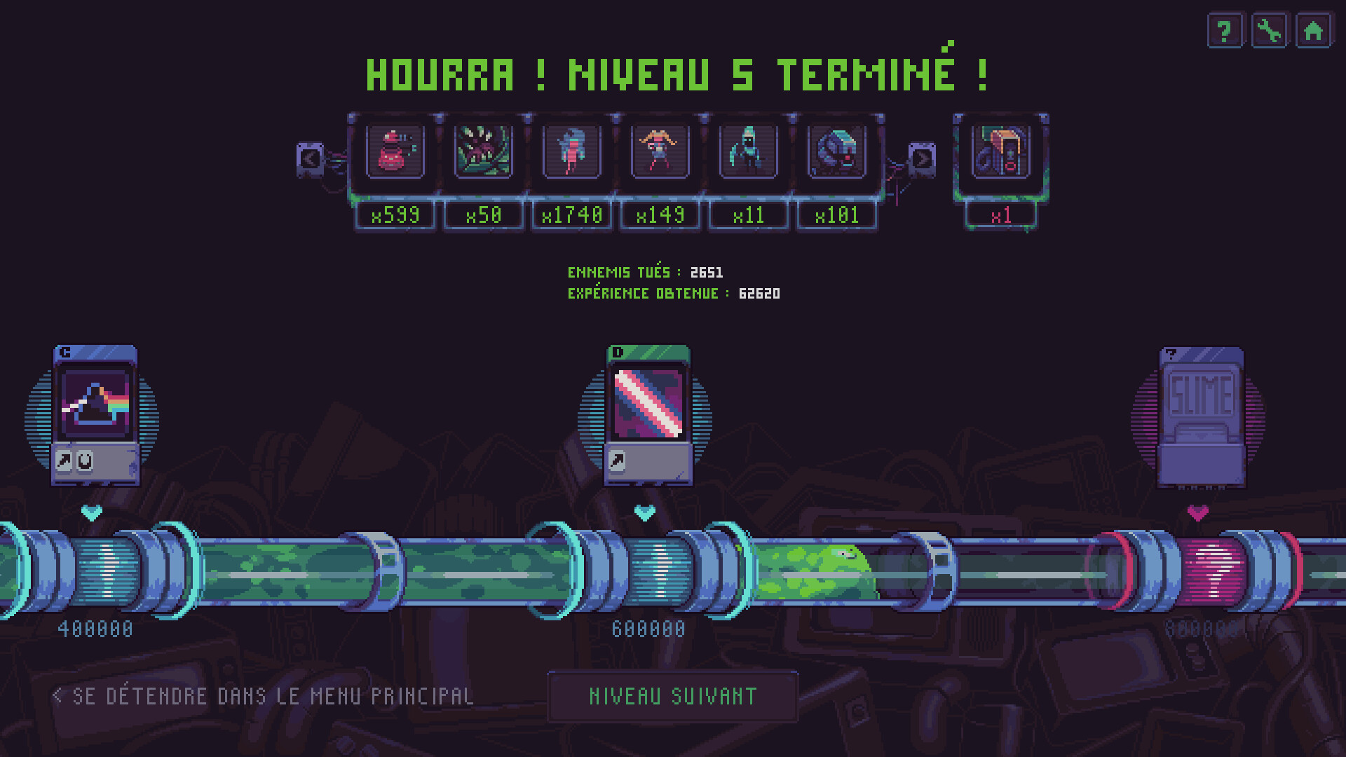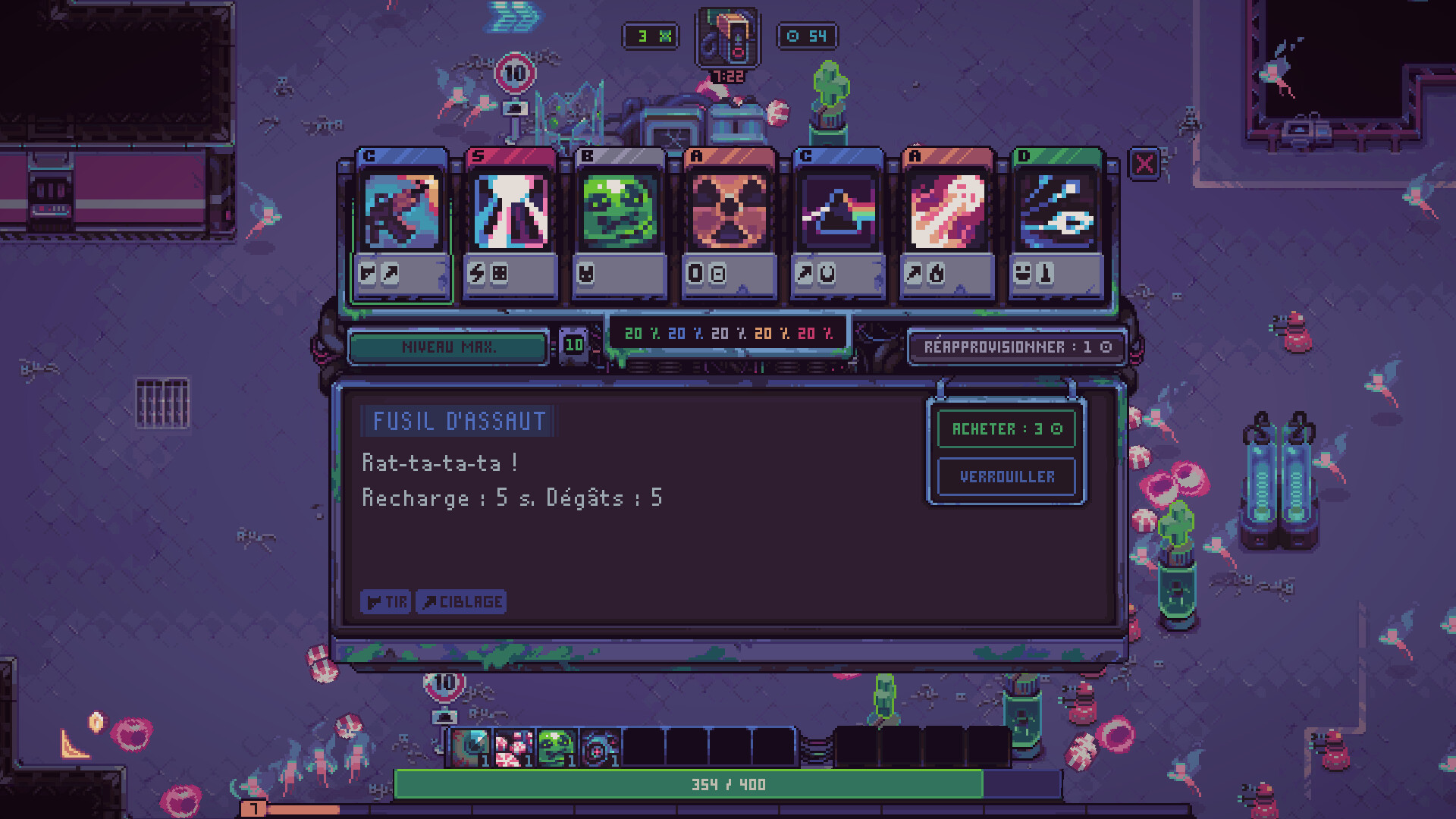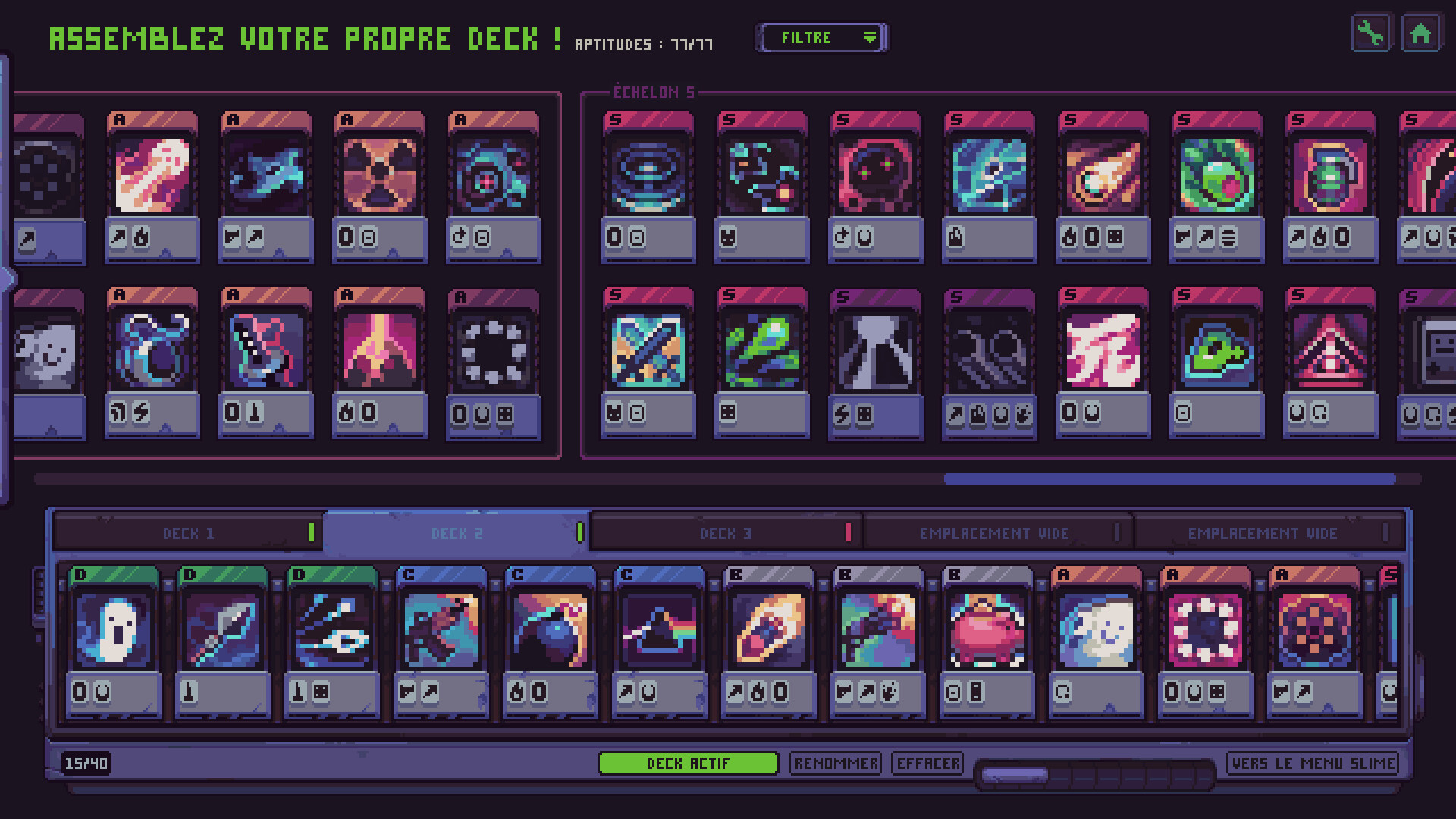 Slime 3K ajoute une dimension stratégique et une expérimentation créative à la formule du Survivor-like avec son système de construction de deck avancé. Déverrouillez, améliorez et testez des combos de cartes pour établir un arsenal d'armes et de traits improbables. Créez à chaque partie le parfait générateur de bain de sang !