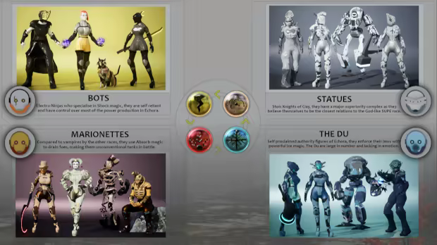Collect humanoid and monster companions from 8 races, each with their own regions, settlements and elemental affinities. Spend stat and skill points to gain new abilities for your team and player character. Mix different squad compositions in real-time combat while exploring on foot or by vehicle.
