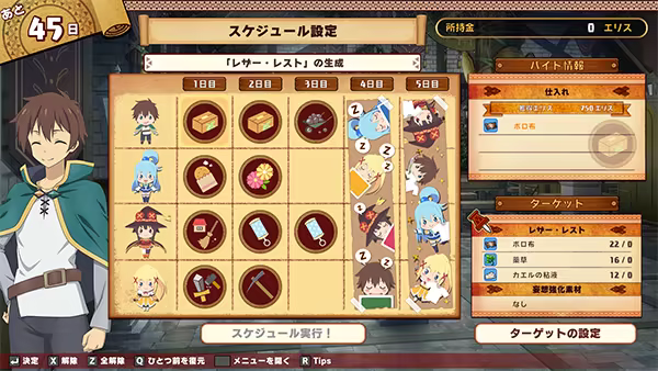 カズマ、アクア、めぐみん、ダクネスのスケジュールを設定!