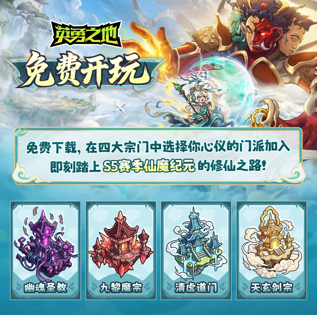 英勇之地:S5赛季「仙魔纪元」版本正式上线。修仙何必拘泥于那一方天地?沙盒修仙亦能给你不一样的仙途造化。以凡躯赴仙缘,以法宝证大道,道友,敢闯这方生死博弈的修真秘境吗?