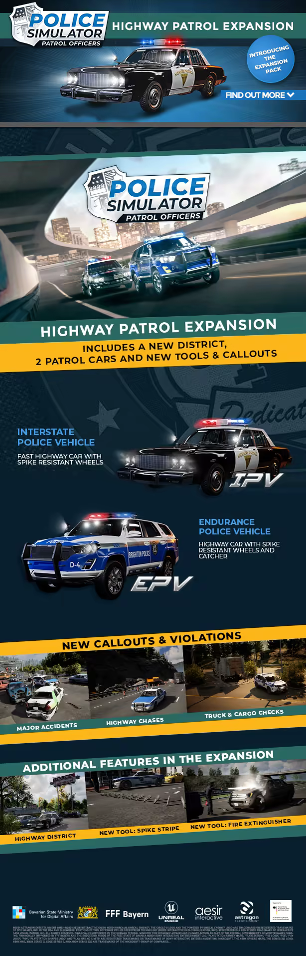 Discover the Police Simulator: Patrol Officers expansion and extend your patrol area! Explore the diverse surroundings and beauty of the wider State of Franklin as you engage in intense highway chases, deploy fast-paced PIT maneuvers to tactically stop fleeing suspects who are in violation of the law, and enjoy a more dynamic police simulation experience.