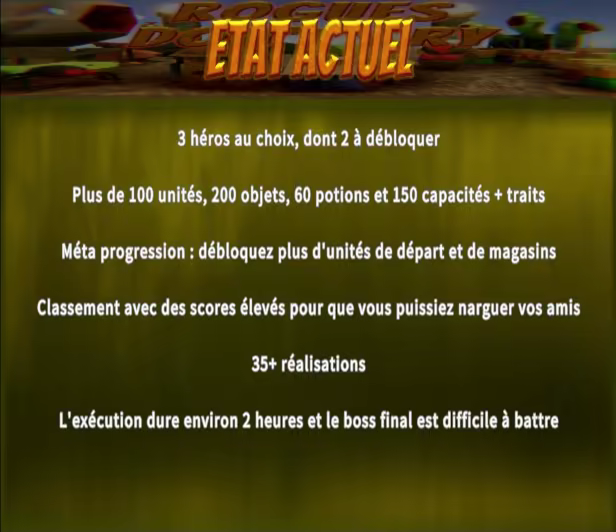 Un jeu pour ceux qui ont joué à des centaines de jeux de stratégie/roguelike et qui veulent quelque chose de nouveau. Construisez votre armée, explorez un monde hostile, livrez des batailles variées, mourez, recommencez, expérimentez, cassez le jeu, devenez un dieu et détruisez tout. Soyez fier.