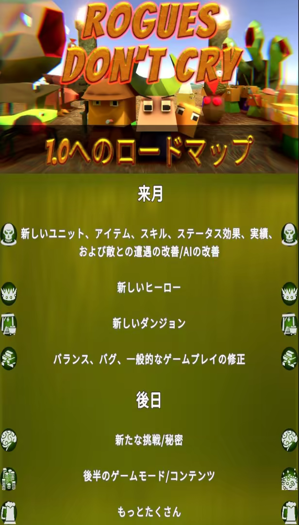 Rogues Don't Cry は戦略とローグライクの融合です。ヒーローを選び、ユニットを雇い、危険なモンスターが出現する過酷な自動生成の世界に立ち向かい、町をアップグレードし、強力な軍隊を管理します。