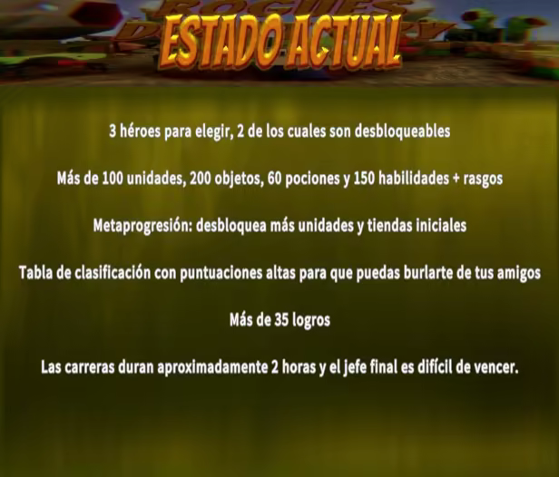 Un juego para aquellos que han jugado cientos de juegos de estrategia y roguelikes y quieren algo nuevo y salvaje. Crea tu ejército, explora un mundo aleatorio y hostil, lucha en batallas variadas, muere, empieza de nuevo, rompe el juego, conviértete en un dios y destruye todo. Siéntete orgulloso.