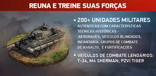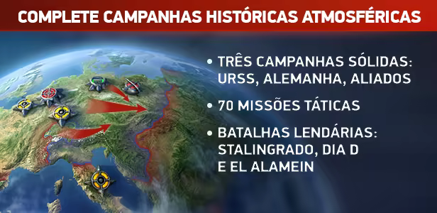 Domine o cambo de batalha em três campanhas históricas que cobrem os principais eventos da 2ª Guerra Mundial: Desde a invasão da Polônia em 1939 até a triunfante captura de Berlim em 1945. Escolha seu lado no conflito - URSS, Eixo ou Aliados! Tome comando das suas forças e ganhe as lendárias batalhas da 2ª Guerra Mundial, que foram recriadas usando mapas históricos precisos. Os melhores estrategistas receberão recompensas adicionais por completar perfeitamente as missões!