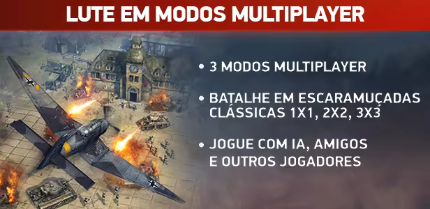 Escolha o seu lado na maior guerra da história e lute contra a rede neural AI ou inimigos reais. Melhore suas habilidades táticas no clássico modo Skirmish 1x1, 2x2, 3x3, lutando com Boris, amigos e outros jogadores para controlar o mapa. Domine suas habilidades de defesa no gênero exclusivo para a estratégia no Modo assalto, onde um jogador ataca e o outro defende suas fortificações.