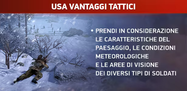 Usa ogni opportunità per sconfiggere il nemico: prendi in considerazione le caratteristiche del paesaggio, le condizioni meteorologiche e le aree di visione dei diversi tipi di soldati per eseguire le operazioni tattiche più audaci. Attacca il nemico quando meno se lo aspetta. Utilizza scouts furtivi e posiziona la fanteria in trincee, fortificazioni, bunker e anche edifici civili!