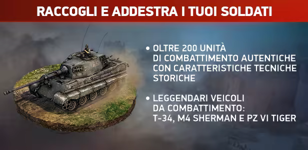 Potrai portare più di 200 unità autentiche di combattimento in battaglia. Tutte sviluppate sulla base di caratteristiche tecniche storiche: più di 100 modelli di veicoli blindati e cannoni semoventi, 40 diversi tipi di squadre di fanteria e assalto e diverse fortificazioni e difese. Ogni unità è dotata di caratteristiche di prestazione ricostruite nel dettaglio, come la velocità di propagazione incendi, la blindatura, il campo visivo e altre che ti permettono di sentirti come un vero e proprio comandante. Metti insieme e addestra l'esercito e forma le squadre per completare le missioni.