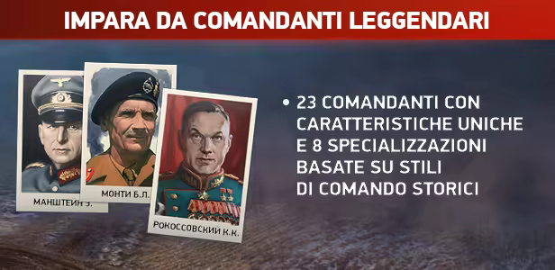 Impara le tattiche di strateghi leggendari! Nomina Zhukov come comandante del tuo esercito e sconfiggi Manstein! Nel gioco sono disponibili più di 20 comandanti, con caratteristiche uniche e tattiche di combattimento basate sugli stili di comando dei loro prototipi storici. Completa le attività in modalità giocatore singolo e multigiocatore e guadagna la fedeltà dei diversi comandanti. Ognuno può offrire bonus utili e funzionalità aggiuntive sul campo di battaglia. Rokossovsky, Rommel, Montgomery - la scelta è tua! Ogni comandante ha la propria specializzazione e le tattiche di combattimento preferite che rendono ancora più diverse le tattiche di sviluppo del gioco, offrendo ulteriori opportunità per combinazioni interessanti.