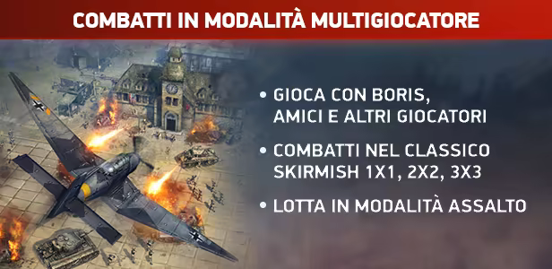 Scegli quale parte essere nella guerra più grande della storia e combatti contro la rete neurale di Intelligenza Artificiale o veri avversari. Migliora le tue competenze tattiche in modalità classica Skirmish 1x1, 2x2, 3x3, combattendo con Boris, amici e altri giocatori per il controllo della zona. Perfeziona le tue abilità di difesa nella strategia unica nel genere - la modalità Assalto, in cui un giocatore attacca e l'altra difende le sue fortificazioni.