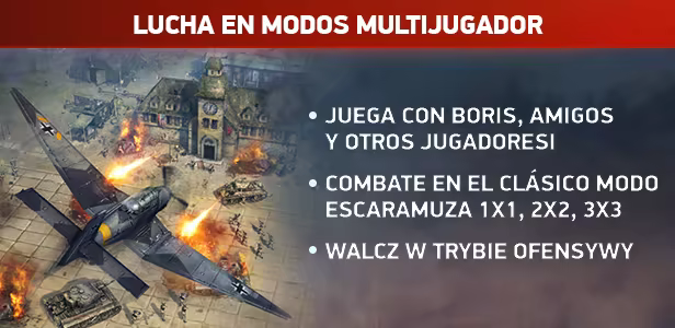 Elige tu bando en la mayor guerra de la historia y lucha contra la IA con red neural u oponentes reales. Mejora tus habilidades tácticas en el clásico modo Escaramuza 1x1, 2x2, 3x3, luchando contra Boris, amigos y otros jugadores por el control del mapa. Domina tus habilidades defensivas en un género de estrategia único: el modo Asalto, en donde un jugador ataca y otro defiende sus fortificaciones.