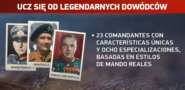 ¡Aprende tácticas de estrategas legendarios! ¡Pon a Zhukov al mando de tus fuerzas y derrota a Manstein! Hay disponibles más de 20 comandantes, cada uno con características únicas y tácticas de combate basadas en estilos de mando reales. Completa diferentes tareas en modos de un solo jugador y multijugador y obtén la lealtad de diferentes comandantes. Cada uno te dará útiles bonificaciones y características adicionales en el campo de batalla. Rokossovsky, Rommel, Montgomery: ¡la elección es tuya! Cada comandante posee su propia especialización y tácticas de combate favoritas que hacen que el desarrollo de tácticas en el juego sea más diverso, proporcionando mayores oportunidades para llegar a combinaciones más interesantes.