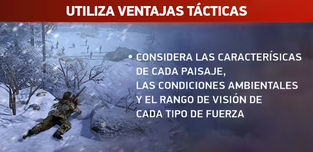 Utiliza cada oportunidad para derrotar al enemigo: considera las características del paisaje, las condiciones ambientales y el rango de visión de cada tipo de fuerza para llevar a cabo las más osadas operaciones tácticas. Ataca al enemigo cuando menos lo espera. Utiliza tropas de reconocimiento y ubica a la infantería en trincheras, fortificaciones, fortines ¡e incluso construcciones civiles!