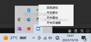 回到游戏的方式也很简单,通过右键点击系统左下角的图标就可以切换回游戏模式。除此之外,系统托盘的菜单还提供了关闭音乐只播放不同天气的环境音(鸟叫声,雨点声和篝火声音)等功能。