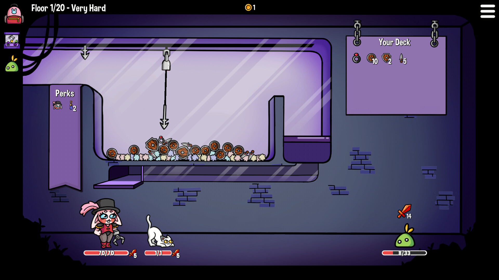 Dungeon Clawler is a Roguelike Claw Machine Deckbuilder. Build your deck, grab weapons and items from the claw machine to battle enemies, discover powerful perks that create game-changing synergies and unleash crazy combos as you fight your way through the dungeon!