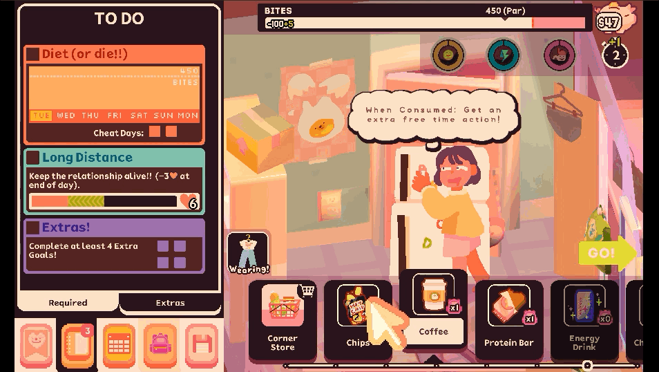 Can you win the heart of the boy of your dreams? Can you hold on to it? Can you chart a course towards a sustainable future? Can you fit just one more TODO goal on your plate, or is it already full to bursting? Most importantly, does any of this matter--either in the game, or in a broader sense? I don't have time to spoil the story here, so I'll just give you a free tip: if you have the spare money, buy some coffee at the corner store and drink it for an extra free-time unit.