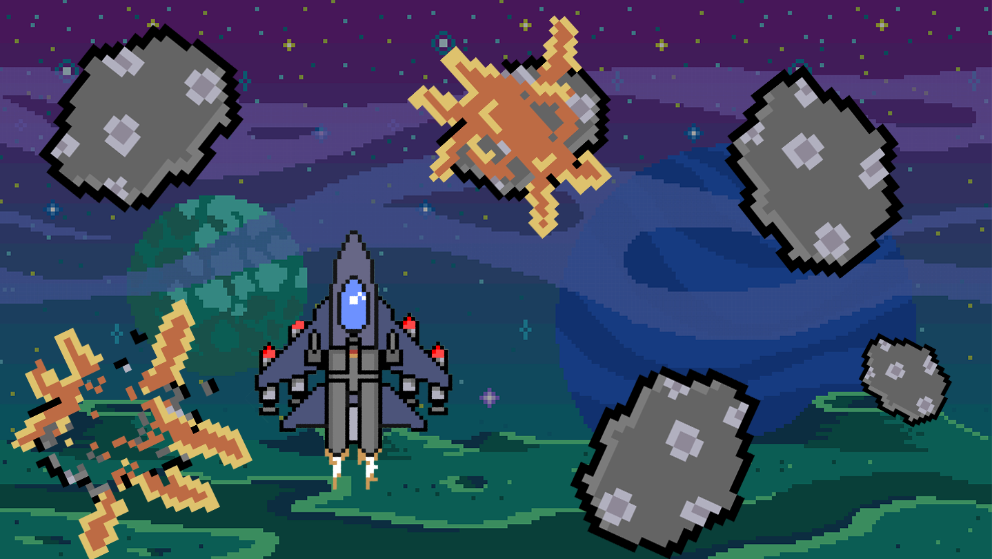In Spaceship Racer: Portal you fly with different "spaceships" through very different worlds, destroying asteroids and improving and buying new spaceships, in retro pixel acade style, trying to get an ever higher high score.