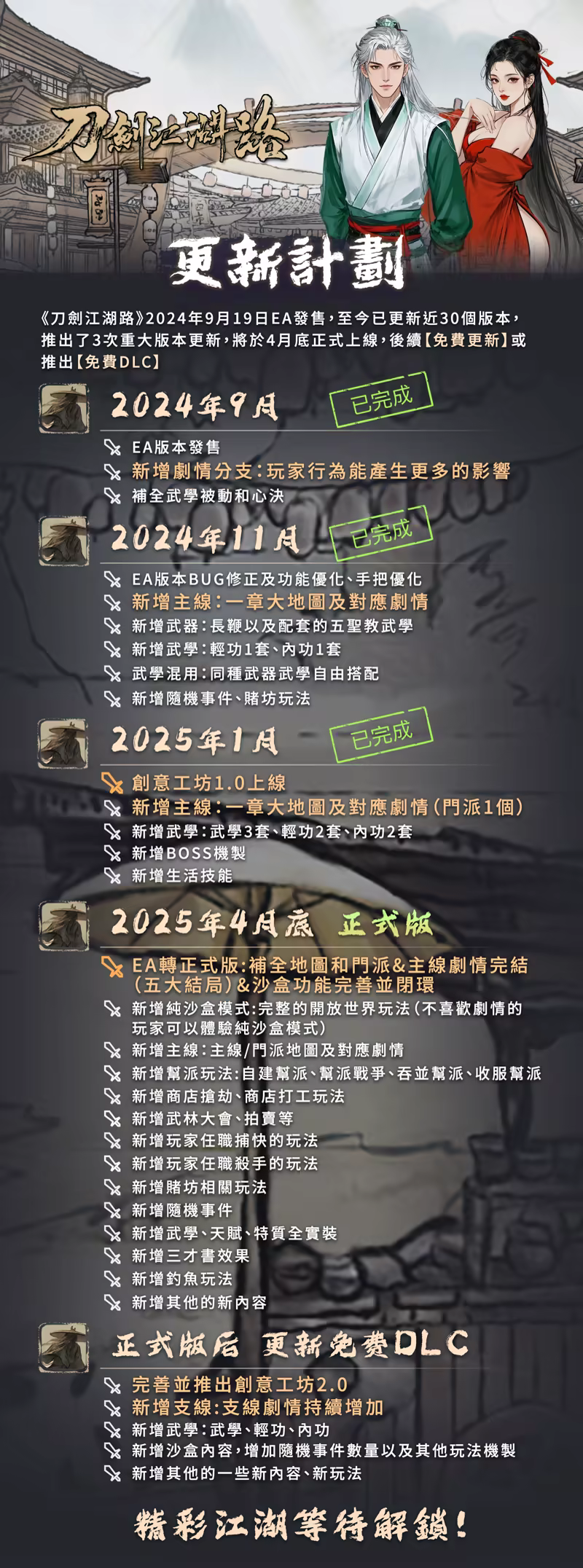 EA至今7個多月,在經過了近30次更新,推出了3個重大版本更新後,《刀劍江湖路》正式轉正,完結主線劇情(五大結局)&推出沙盒內容,後續推出【免費DLC】