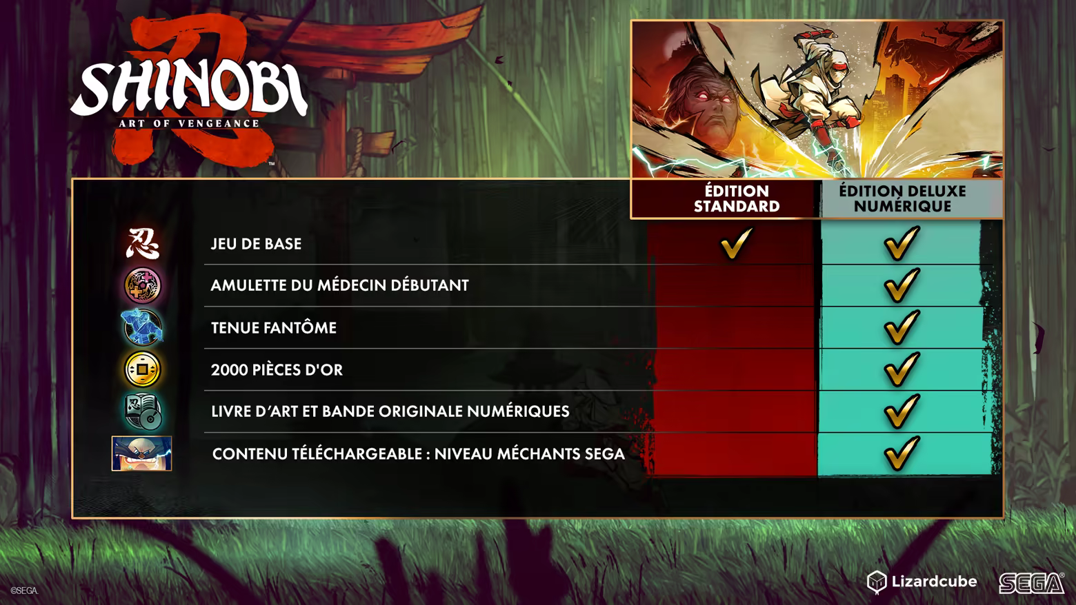 Achetez l'édition Deluxe numérique de SHINOBI: Art of Vengeance pour recevoir le pack de démarrage, le livre d'illustrations et la bande-originale numériques et le niveau SEGA Villains, où vous attendent le Dr Robotnik et deux autres fameux boss de l'univers SEGA.