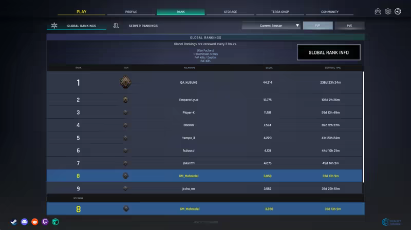 Performance from PvP and PvE official servers is separately totaled and reflected in the global rankings.