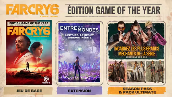 L'édition Gold de Far Cry® 6 comprend le jeu ainsi que le Season Pass (3 nouveaux DLC) où vous incarnerez vos antagonistes Far Cry préférés.