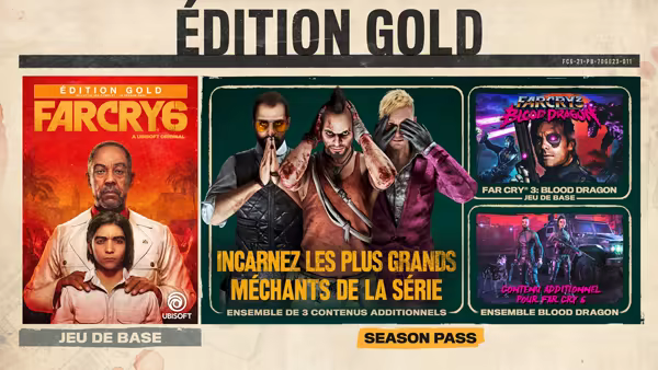 L'édition Gold de Far Cry® 6 comprend le jeu ainsi que le Season Pass (3 nouveaux DLC) où vous incarnerez vos antagonistes Far Cry préférés.