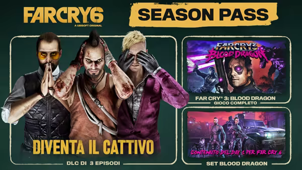 Far Cry 6 Season Pass: Il Season Pass include 3 DLC e Far Cry® 3: Blood Dragon. Gioca nei panni dei cattivi Vaas, Pagan Min e Joseph Seed e tuffati nei meandri della loro psiche.