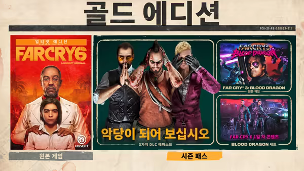 Far Cry® 6 시즌 패스에는 Far Cry®의 인기 악역이 등장하는 DLC 3종과 Far Cry®3 블러드 드래곤 클래식 에디션이 포함되어 있습니다.