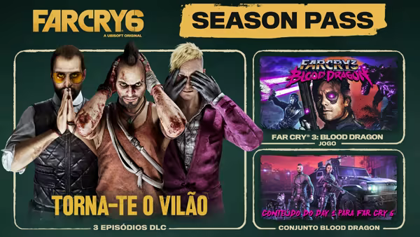 O Season Pass de Far Cry® 6 contém três DLCs, incluindo os teus vilões preferidos de Far Cry®, e o icónico Far Cry® 3 Blood Dragon Classic Edition.