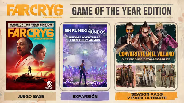Season Pass de Far Cry 6: el Season Pass incluye tres DLC y Far Cry® 3: Blood Dragon. Juega como los villanos Vaas, Pagan Min y Joseph Seed, y profundiza en sus mentes.