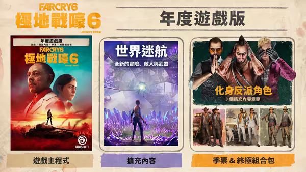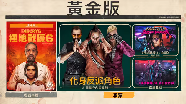 《極地戰嚎 6》季票包含以熱門《極地戰嚎》反派角色為主題的 3 款擴充內容,外加經典的《極地戰嚎 3:血龍》經典版。