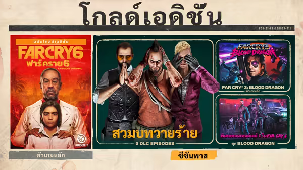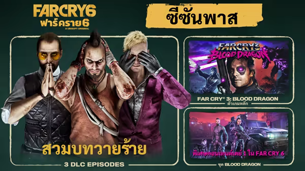 Far Cry® 6 Season Pass ประกอบด้วย DLC สามชุดที่มีเหล่าวายร้าย Far Cry® ที่คุณชื่นชอบและ Far Cry® 3 Blood Dragon คลาสสิกเอดิชั่นที่ขึ้นชื่อ