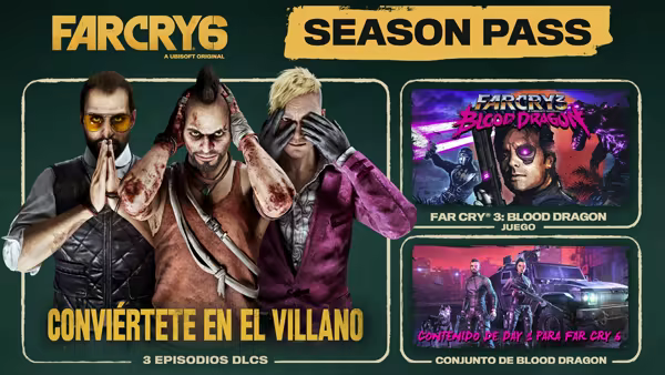 El Season Pass de Far Cry® 6 contiene tres DLC con tus villanos de Far Cry® favoritos y el emblemático Far Cry® 3: Blood Dragon Classic Edition.