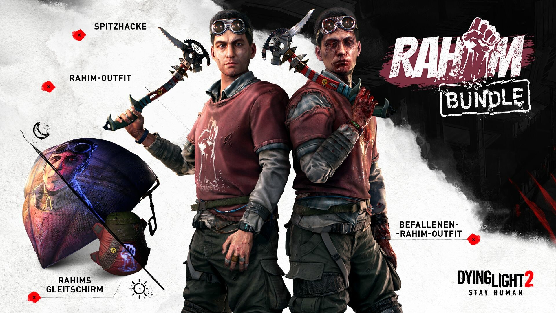 Stellen Sie sich vor, wie das Leben Rahims außerhalb von Harran ausgesehen hätte. Durchstöbern Sie die Straßen Villedors als schadenfroher Läufer oder nehmen Sie seine leblose Gestalt in seiner Outfit-Variante als spezieller Infizierter an. Bewahren Sie einen kühlen Kopf, wenn Sie sich gegen Horden mit der Spitzhacke durchsetzen, die nun feurigen Schaden anrichtet. Fliegen Sie wie ein Profi durch die Lüfte mit dem neuen im Dunkeln leuchtenden Gleitschirm.