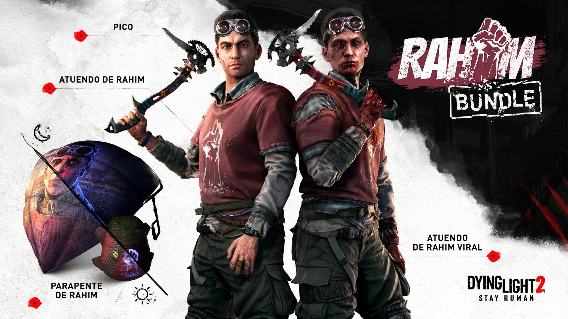 Imagina cómo habría sido la vida de Rahim fuera de Harran. Recorre las calles de Villedor como el presumido corredor o cámbiate de bando con el atuendo especial de modo infectado. Mantén el estilo mientras te defiendes de hordas de infectados con el pico, que fue modificado para infligir un daño infernal, y surca los cielos como un profesional con un nuevo parapente que brilla en la oscuridad.