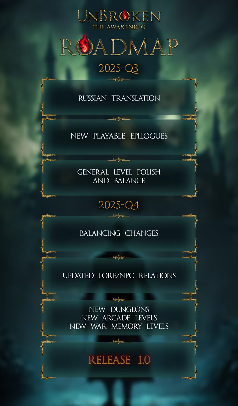«I believe the communities input will be the best way to finalise Unbroken. The game itself has all major features implemented, so feedback from the players will be critical to add the final spit and shine, balance, bugfixes until deemed good enough to go 1.0. by the Community.»