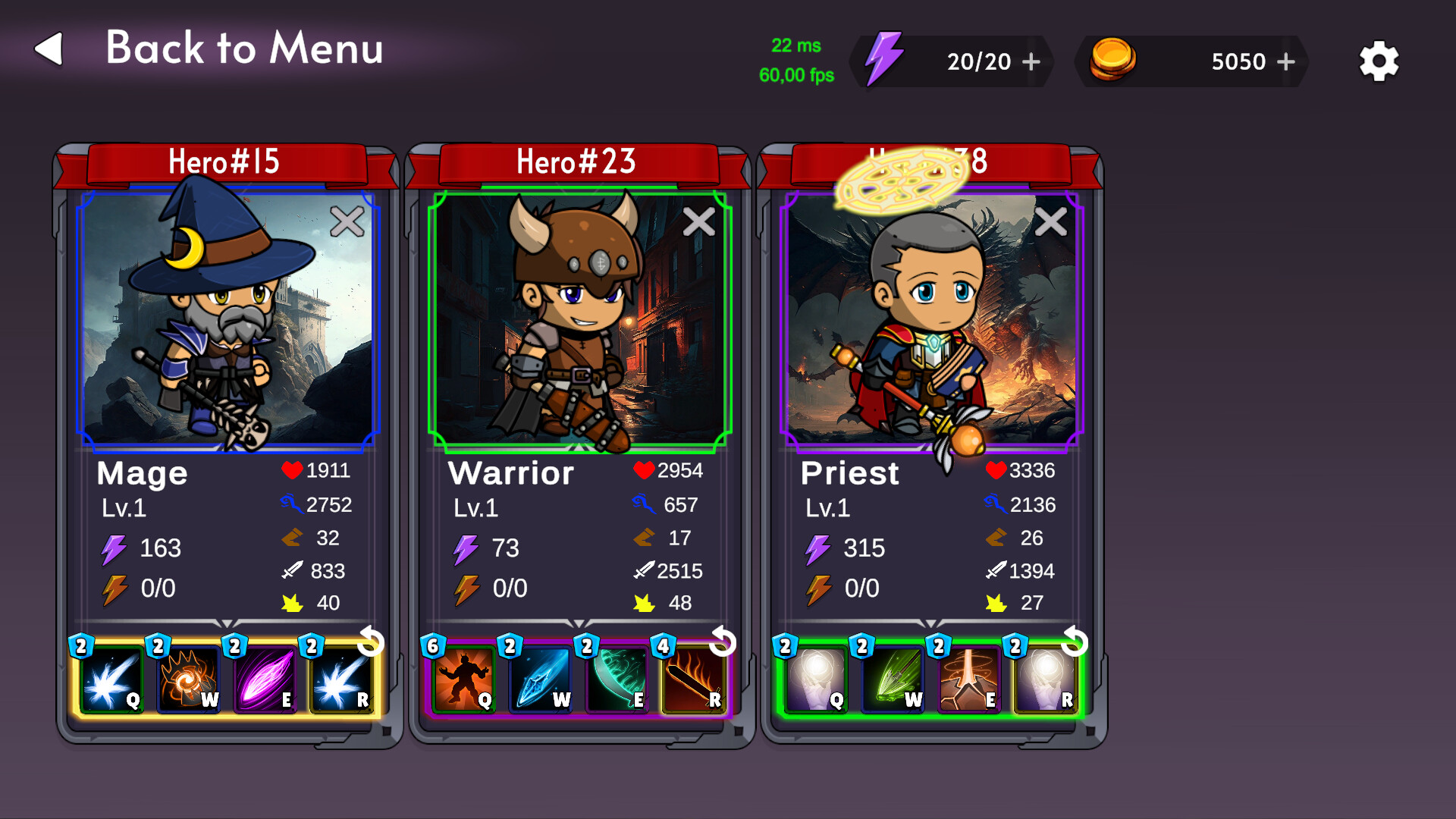 The game contains 5 different classes of Hero, with specific abilities, basic attacks and stats. Abilities range from a variety of types and utility like damage, healing, projectile, movement, specialty and are affected by the player's stats. The battles (PvP or PvE) are fought with 1 to 3 Heroes per team, in maps designed with unique characteristics and terrain.