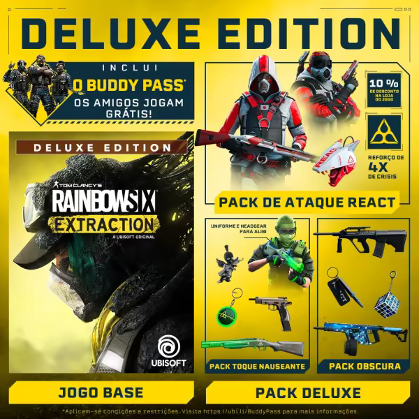 • Os jogadores de Tom Clancy's Rainbow Six® Siege recebem quatro conjuntos de equipamento épicos exclusivos para ambos os jogos e desbloqueiam instantaneamente 18 operadores do Tom Clancy's Rainbow Six® Extraction no Tom Clancy’s Rainbow Six® Siege.