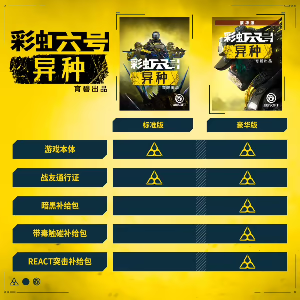 • 《彩虹六号®:围攻》玩家能够获得两款游戏通用的专属史诗套装,还能在《彩虹六号®:围攻》立刻解锁《彩虹六号®:异种》的18名特勤干员。
