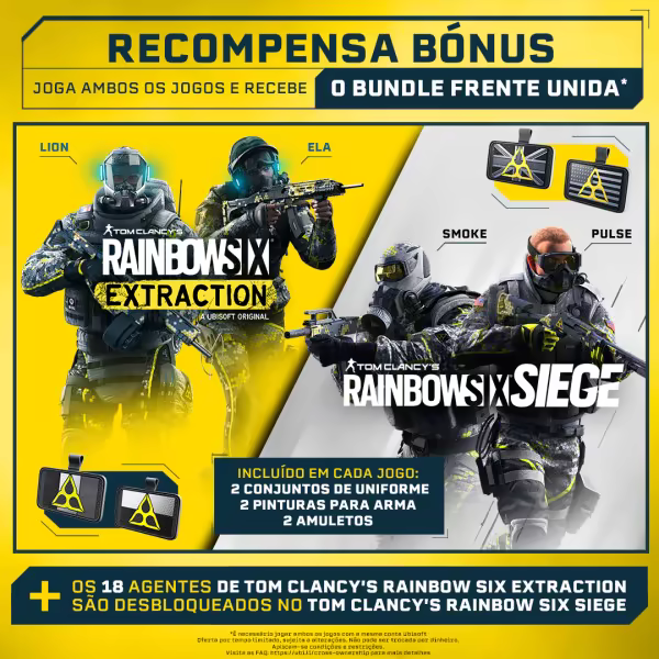 • Os jogadores de Tom Clancy's Rainbow Six® Siege recebem quatro conjuntos de equipamento épicos exclusivos para ambos os jogos e desbloqueiam instantaneamente 18 operadores do Tom Clancy's Rainbow Six® Extraction no Tom Clancy’s Rainbow Six® Siege.