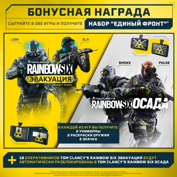 • Играйте в Tom Clancy's Rainbow Six® Осада и получите 4 особых комплекта снаряжения в обеих играх, а также разблокируйте 18 оперативников из Tom Clancy's Rainbow Six Эвакуация в Tom Clancy’s Rainbow Six Осада.